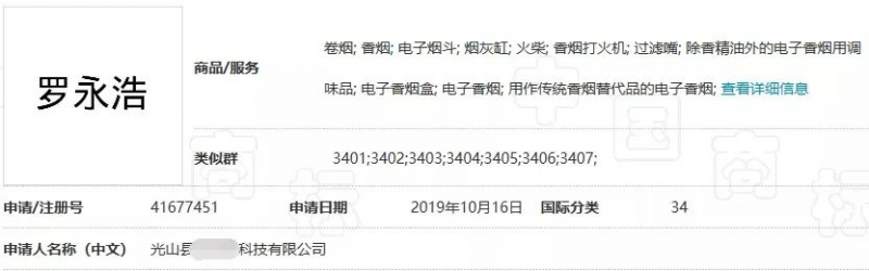 據(jù)商標(biāo)局官網(wǎng)顯示,2019年10月16日,光山縣XXX科技有限公司(下稱光山縣公司)注冊(cè)“羅永浩”商標(biāo),類別為煙草,目前該商標(biāo)處于等待實(shí)質(zhì)審查的階段。
