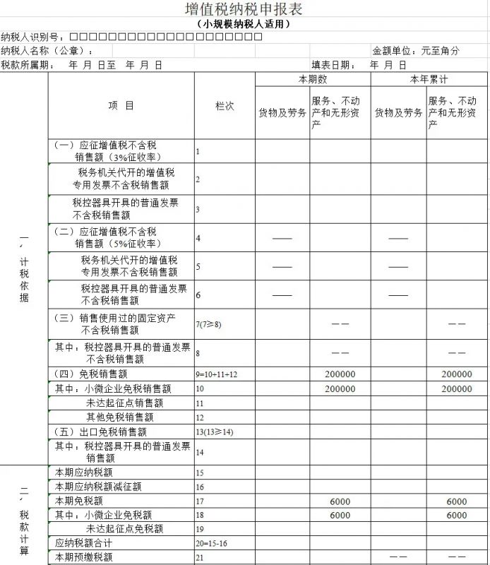 (二)填寫主表根據(jù)4號公告規(guī)定,《增值稅納稅申報表(小規(guī)模納稅人適用)》中的“免稅銷售額”相關(guān)欄次,填寫差額后的銷售額,因此第9欄填寫200000元。
