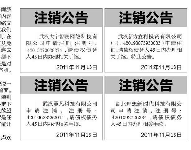 5、申請登報日期:這個需要企業(yè)跟報社事先講清楚,注銷公司的公告哪年哪月哪日必須跟你見報,一般這個日期是跟你去工商部門辦理注銷時間密切相關的。大家需要注意的是,如果公告時間不足是不可以去辦理注銷手續(xù)的。